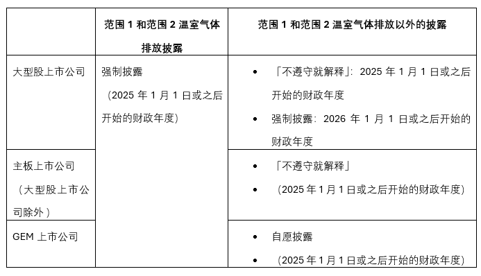 • 强制披露原则披露范围 1 和 范围 2 温室气体排放,主板上市公司需根据“不遵守就解释”原则进行范围1和范围2温室气体排放以外的披露。