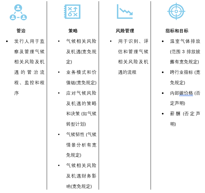• 参照ISSB的IFRS S2标准,推动与国际标准接轨,披露需涵盖管治、策略、风险管理、指标和目标四大支柱,对数据的准确性提出更高要求,尤其是跨部门、多源头的数据收集整合能力。