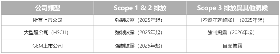 港交所自2025年起要求所有上市公司強制披露Scope 1與Scope 2排放,2026年起大型股公司需全面對齊IFRS S2。董事會應主導制定披露路線圖,確保治理、策略、風險管理與指標具備一致性與前瞻性。